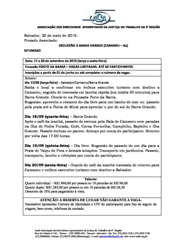 ÚLTIMAS VAGAS PARA BARRA GRANDE – CAMAMU