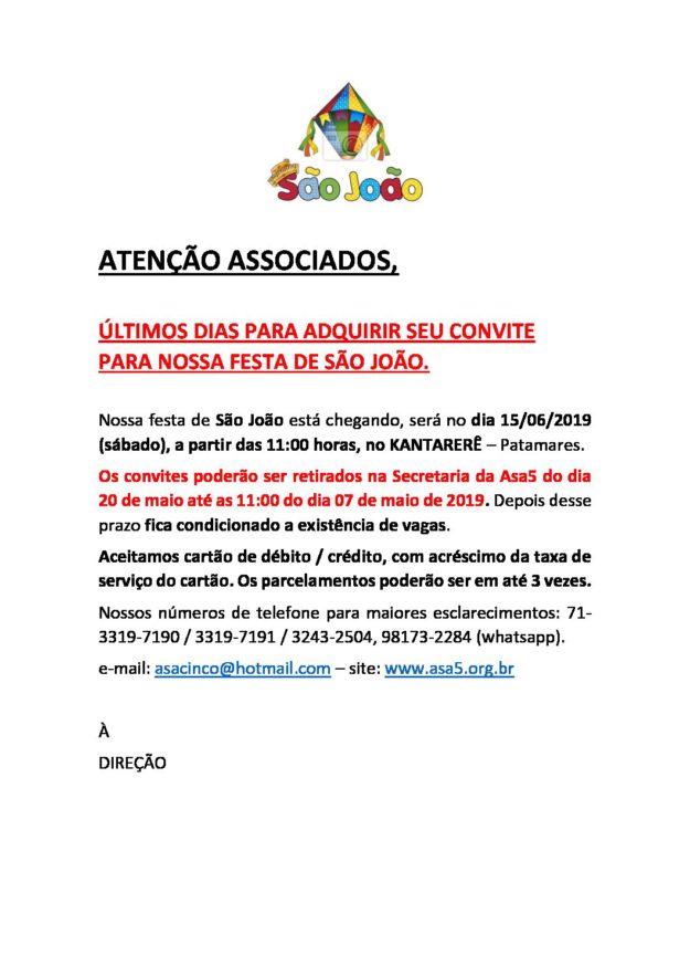 ATENÇÃO ASSOCIADOS! ÚLTIMOS DIAS PARA ADQUIRIR SEU CONVITE PARA NOSSA FESTA DE SÃO JOÃO. 4 de junho de 2019Sem categoriaBy Edison Emanuel