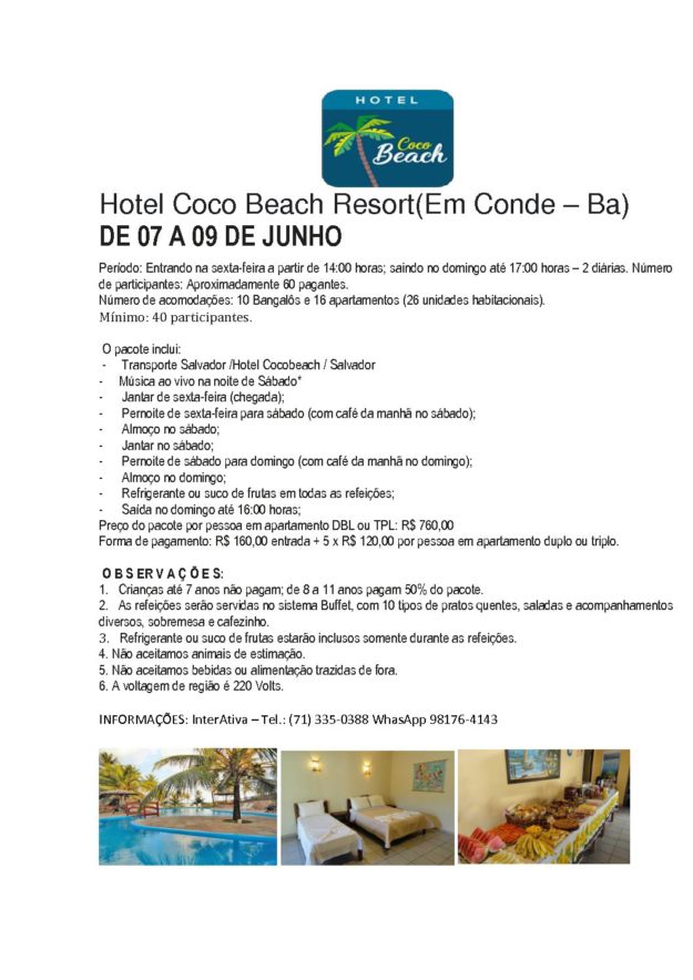 Hotel Coco Beach Resort (Em Conde – Ba) DE 07 A 09 DE JUNHO 13 de maio de 2019Sem categoriaBy Edison Emanuel
